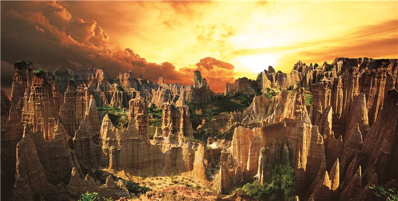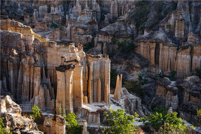 班果土林风景区——位于元谋县城西部,地理坐标东经101°46′—101°47′,北纬25°43′—25°46′,距元谋县城12公里,海拔1100米,面积14平方公里。班果土林中间有一条宽阔的大沙河,河两旁分布着一条条横向延伸的支流冲沟,每条冲沟都似迷宫,如高大的胄甲武士 ,一排排如两军对峙,又似夹道欢迎远方来客光临这沉睡千年的大漠世界。走进窄小的冲沟,里面却是宽敞的“跑马场”、“练兵场”,沿四周陡峭的坡坎边缘,土柱峰林密密匝匝,形态万千,酷似规模宏大的古建筑群,犹如东南亚的座座佛塔,欧洲哥德式的古城堡,古埃及的狮身人面像,古罗马的大教堂,西藏的布达拉宫,故宫的盘龙柱,数不胜数,目不暇接,任尔充分发挥丰富的想象。而镶钦在上面的雨花石、云母、硅化木,如“玛瑙”、“宝石”,金银般在阳光下闪闪发光,呈现出五光十色的异彩,集古今中外的雕塑、建筑造型艺术,神话般地展现在一条条“艺术走廊”之中。在距班果土林南部不远处,有华竹大己堡土林,则是另一番景致,这里的土林全部是白色的,远看如岷山千里雪,如云海,似雪原,茫茫一片。近看如宫殿、玉柱、仙鹤、骆驼、野象、菩萨等等,酷似牙雕玉琢而成,色泽皑皑,令人眼花缭乱。土林中间点缀着灌木林和草坪,四季常绿,山花点点。