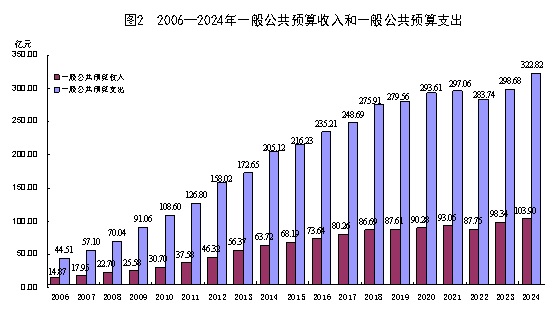 全年完成地方财政总收入222.24亿元,比上年增长3.9%;一般公共预算收入103.90亿元,增长5.7%,其中:税收收入57.29亿元,增长0.7%;非税收入46.61亿元,增长12.4%。一般公共预算支出322.82亿元,增长8.1%。